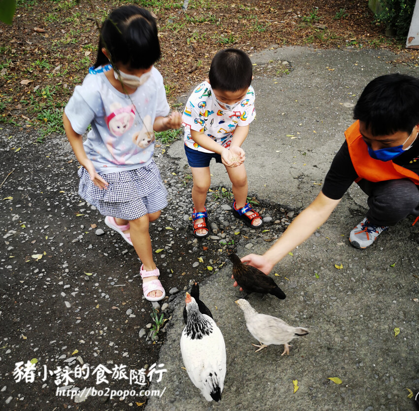 一進園區,還會看到不少自然放養的雞在奔跑,拿到的雞飼料就能派上用場。