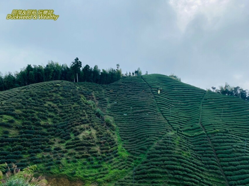 「大崙山觀景台」濃綠地毯般的茶樹,交織出的景色美不勝收!要是走累了,
