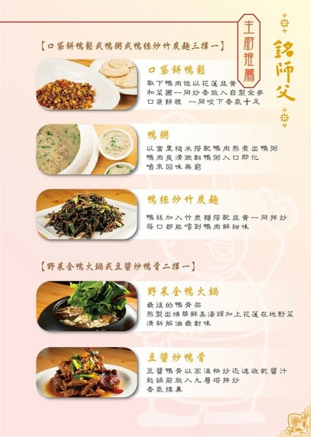 除了傳統的片鴨包餅、豆醬炒鴨骨還有鴨粥跟以鴨骨精心熬製成湯底的野菜全鴨火鍋。