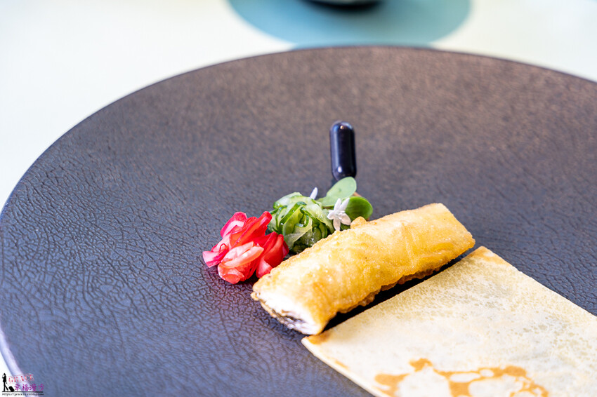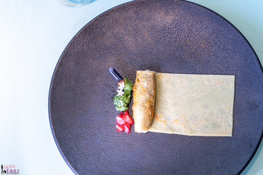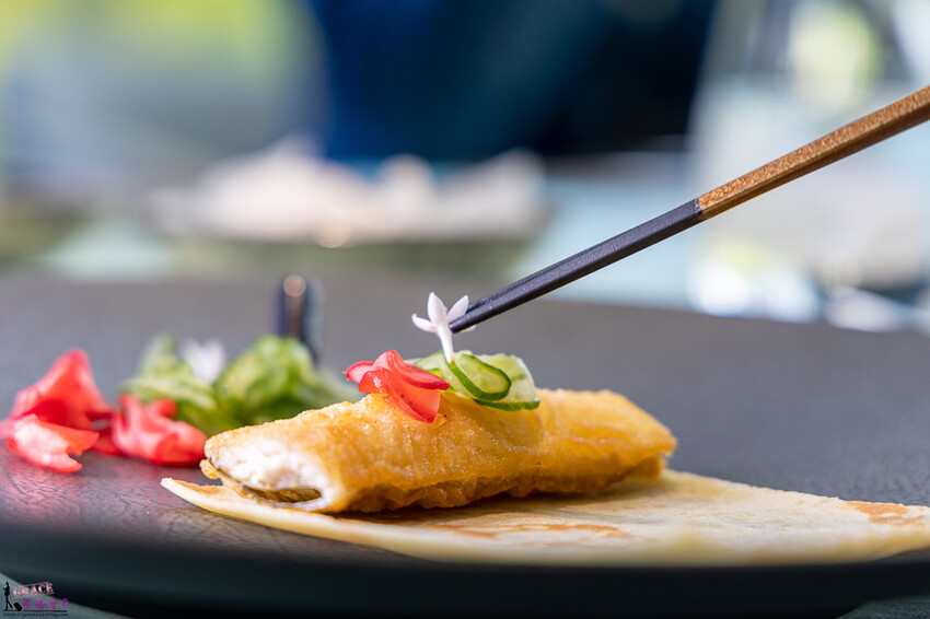 接著再將可麗餅把香魚包裹著一起入口,餅皮不會太厚、香魚酥脆肉質鮮美,配菜脆口整個層次感很豐富。