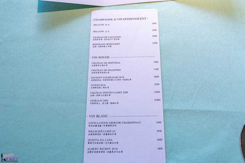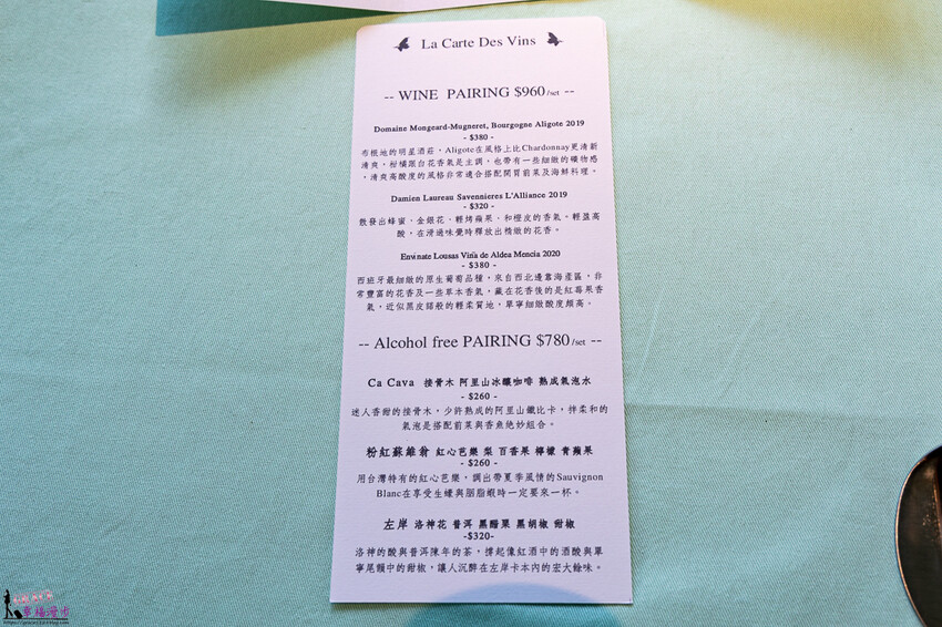 吃法菜當然要配個葡萄酒,這裡有提供整套葡萄酒(杯)搭配一套是960元,不喝酒的也有無酒精飲品。還是要溫馨提醒開車不喝酒、喝酒不開車。