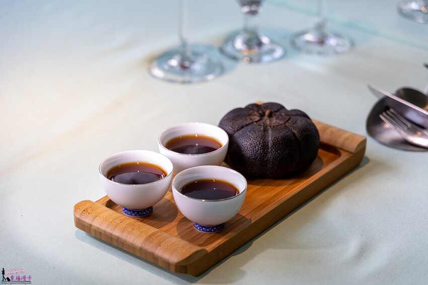 九蒸九曝酸柑茶,是採用客家的九蒸九曝酸柑茶,再用陳皮、原生香檬一起去調和,酸酸的口感可以調整一下味蕾。