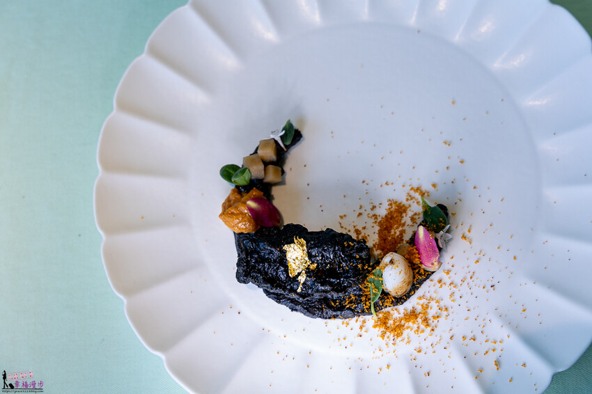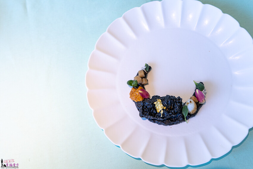 生蠔,這一道也太特別了,有著生蠔、紋甲花枝、墨魚汁竹炭白花椰米,這道主廚是以嵐山渡月橋美京、鹿苑金閣寺為想法,彎月型的造型,在生蠔上撒上金箔,整個很有意境。