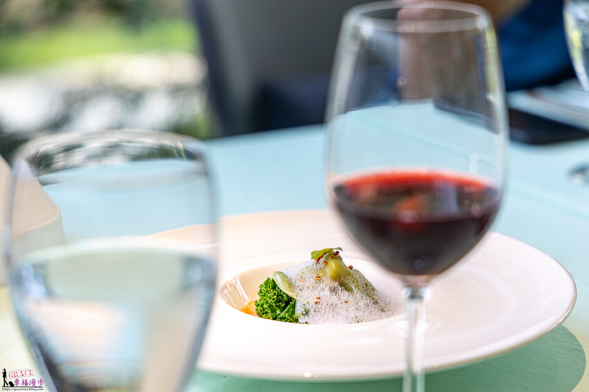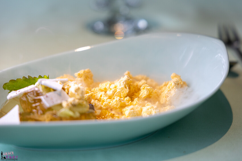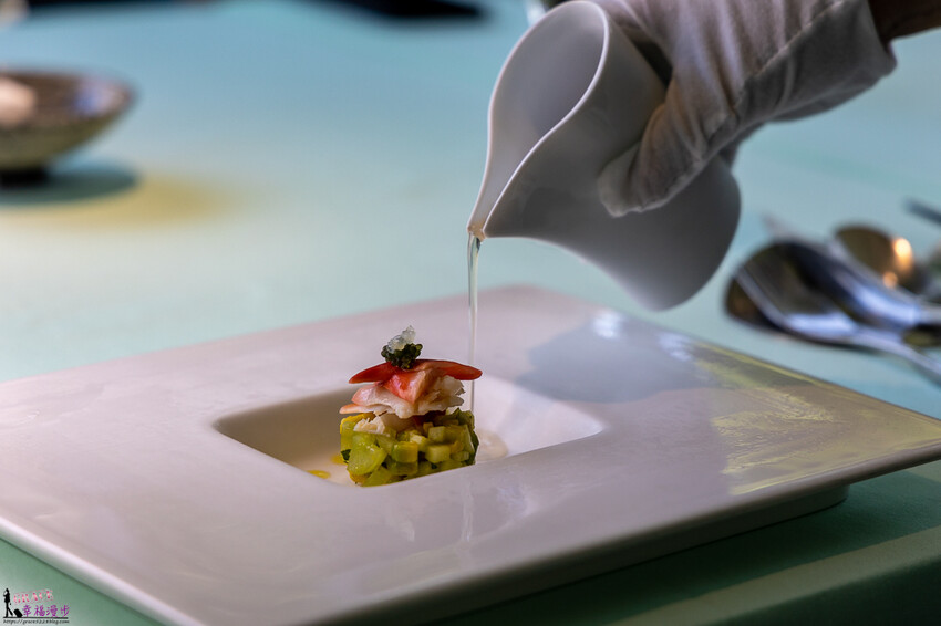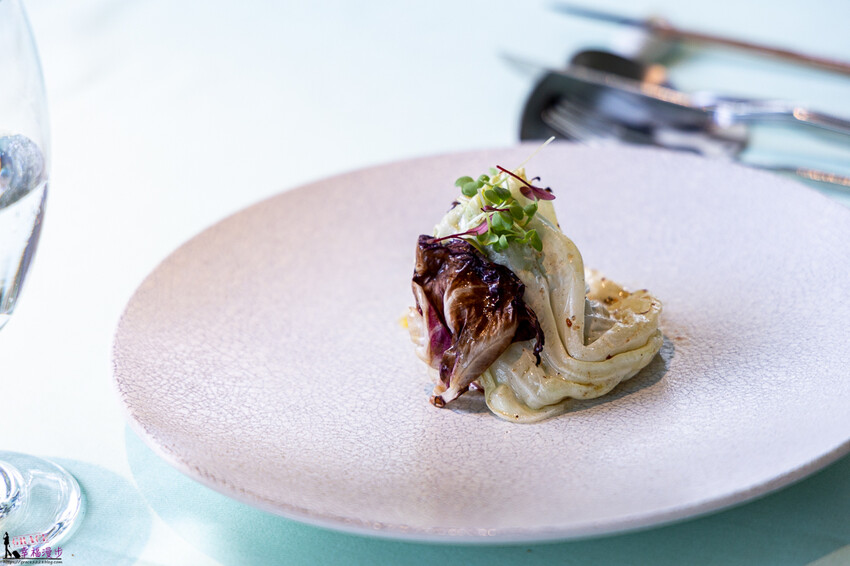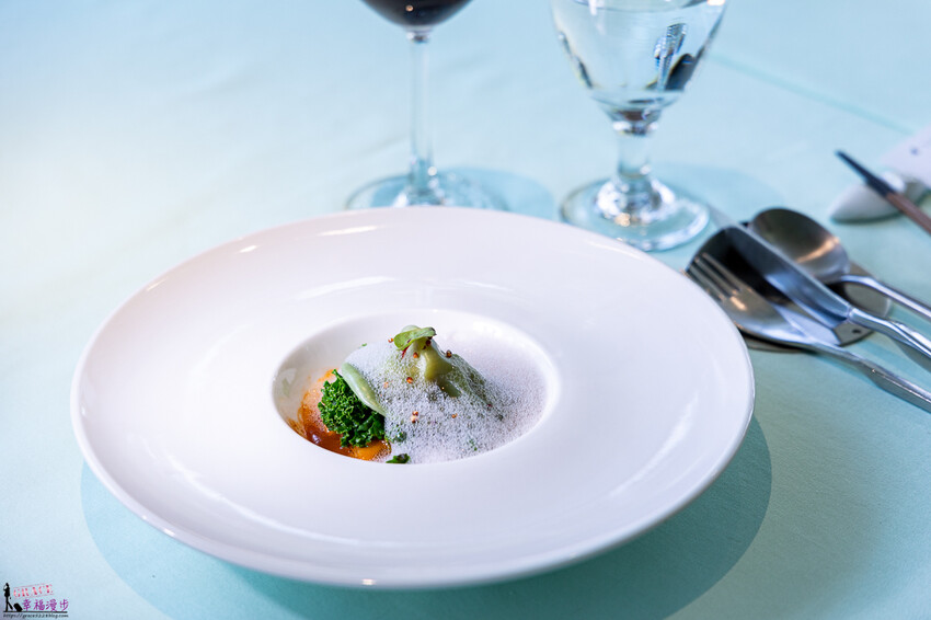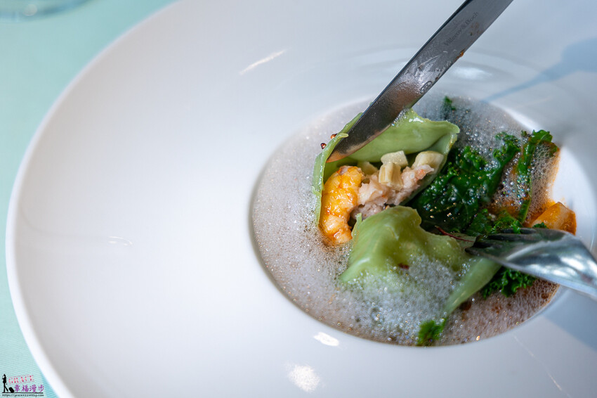 將泡泡撥開有著義大利餃子,切開後裡面有著胭脂蝦和竹筍,底層的部分有著慢煮的胭脂蝦、竹筍、生命豆、羽衣甘藍,吃的時候搭配著底層的龍蝦醬汁一起食用。