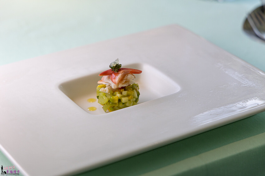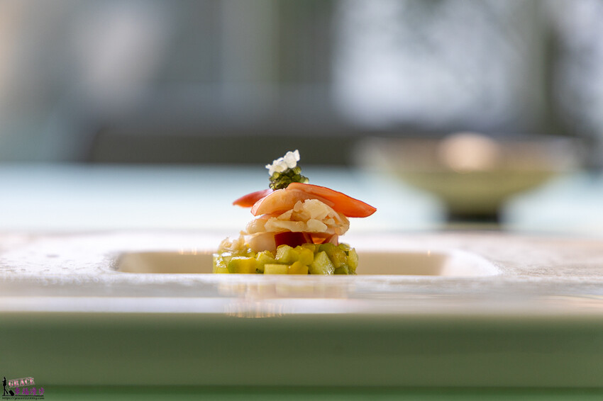北寄貝,底部是由酪梨、青蘋果所組合,上方放著北寄貝再用海葡萄、白色是拇指檸檬去點綴,淋上馬鞭草、昆布醋調成的冷湯,食用時需攪拌後再一起食用。