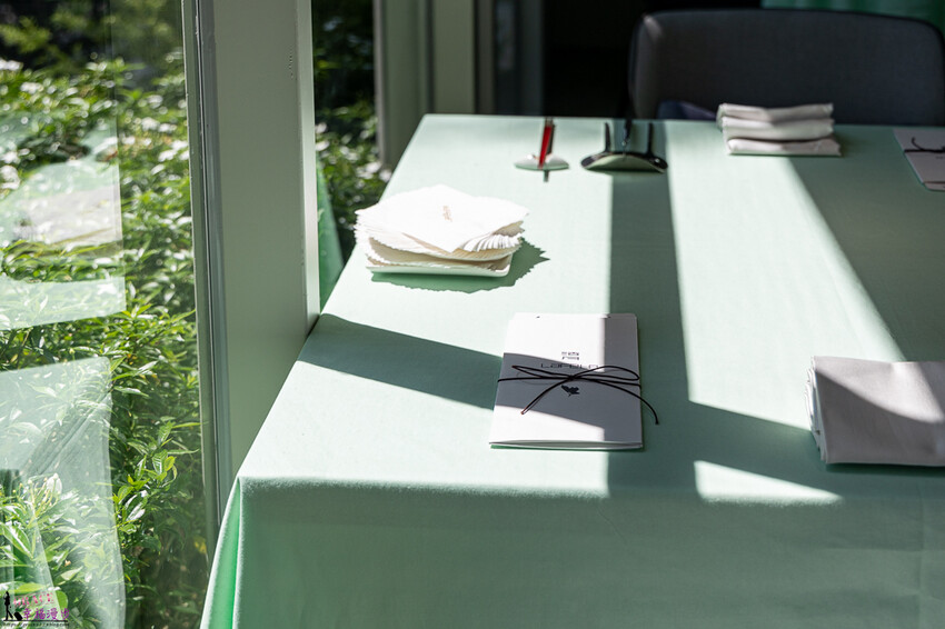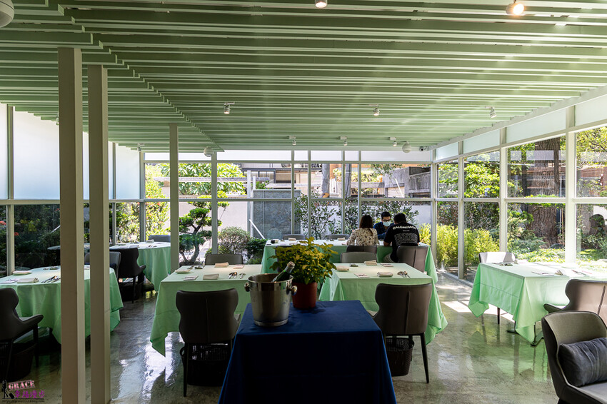 用餐區相當明亮,湖水綠的顏色跟庭園的植栽互相呼應,據說這個顏色可是全球最受歡迎且可以治癒心情的顏色,餐廳內的桌子有適合兩人用餐的座位區、多人用餐的長方桌和圓桌。