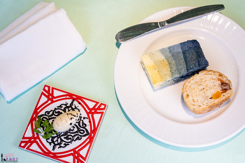 用青黛做成的漸層麵包口感相當輕柔,搭上略帶鹹香的鯷魚奶醬更是討喜啊!這麵包都可以再續加喔!