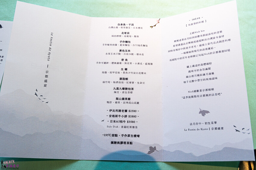 法月的MENU,一共有三種價格,餐點會隨著季節去做替換,是採用台灣在地小農食材、傳統法式料理呈現,這一季的主題是京都饗宴,主廚將京都旅遊的回憶融入在了料理裡面,屬於京都的法菜料理。