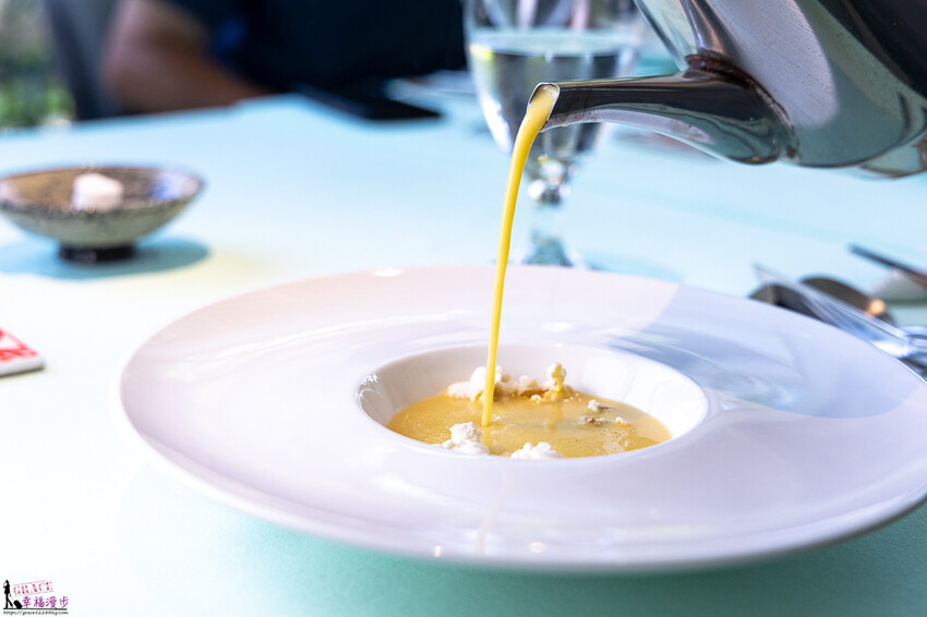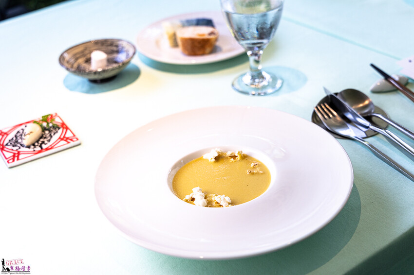 黃色玉米,送上桌盤中只有爆米花,再淋上玉米濃湯,湯頭是使用水果玉米27號、台南26號和洋蔥一起去熬煮的,濃湯緩緩倒入盤中,整個爆米花的香氣被帶領出來,入口後整個玉米香甜環繞在嘴裡。