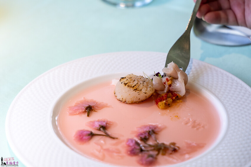 這道料理整個色彩搭配的很好,北寄貝脆口甘甜、冷湯的清香、水果的酸甜,清爽又鮮美的料理。