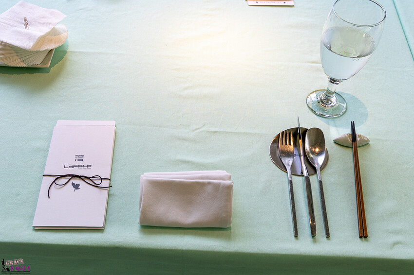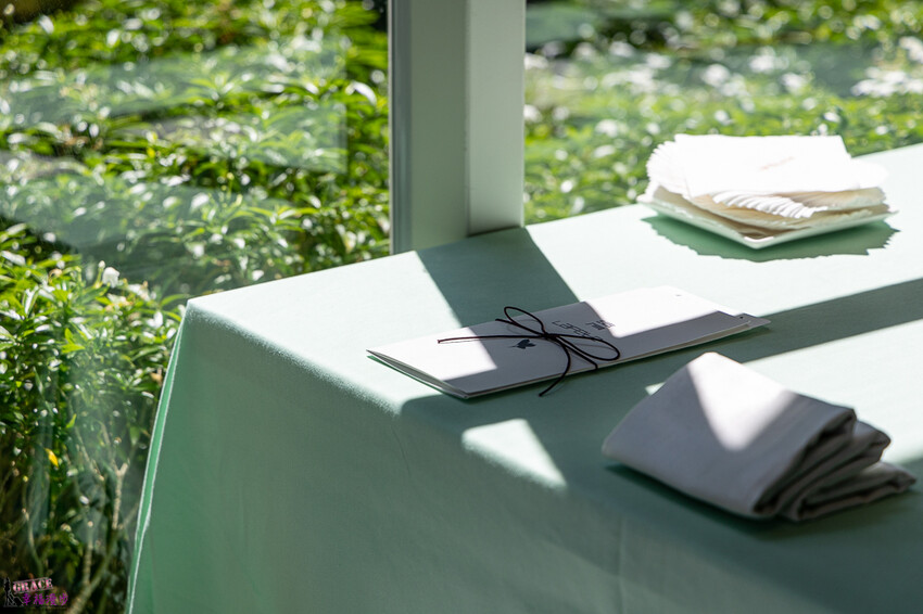 逛了一圈後開始準備用餐,桌面的擺設MENU、餐具都很講究,用餐的過程也會來替換餐具,服務相當好。