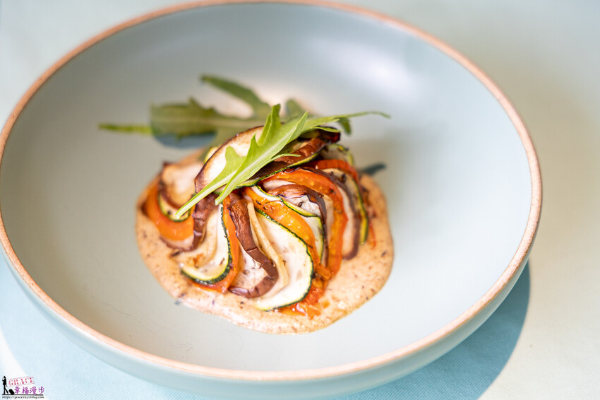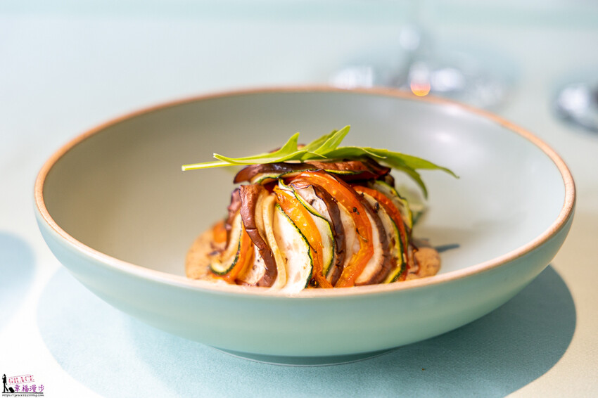 普羅旺斯燉菜,搭配主菜的燉菜,屬於南法的料理手法,有著茄子、杏鮑姑、番茄和櫛瓜去烘烤,搭配底層的松露奶油醬,蔬菜不會太軟沾上濃郁的松露奶油醬真的很好吃。