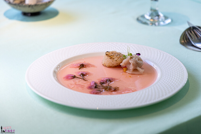炙燒過的干貝更加鮮甜,石雕魚肉質彈牙搭配著微辣的堅果燉菜風味更佳,來自日本酸柚所做成的櫻花晶凍更是爽口開胃啊!