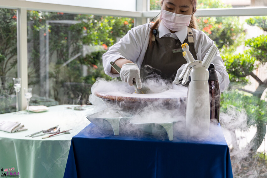 主餐後最期待的就是甜點了,只見服務生推著推車而來,原來是桌邊展示甜點,首先在木盆裡擠入芒果鮮奶油,接著加入氮氣,-195°C冷卻拌炒。