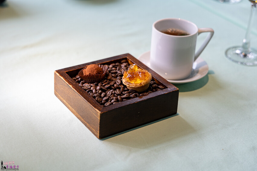 楓糖桃膠塔甜點,有著松露巧克力、桃膠塔的部分下方是布蕾上面有著楓糖桃膠,搭上一杯熱的小葉紅茶也可以添加薄荷葉,用最後的甜點為今天京都饗宴畫上完美的句點。