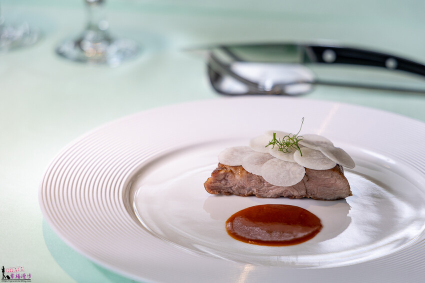 搭配主菜的飲料是左岸,是用洛神的酸與普洱茶做出像紅酒般的酒酸,裡面還有搭配紅椒和黑胡椒讓尾韻更像紅酒的丹寧感,用來搭配主餐恰到好處。