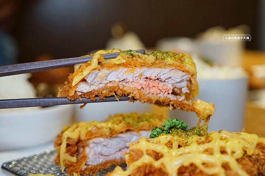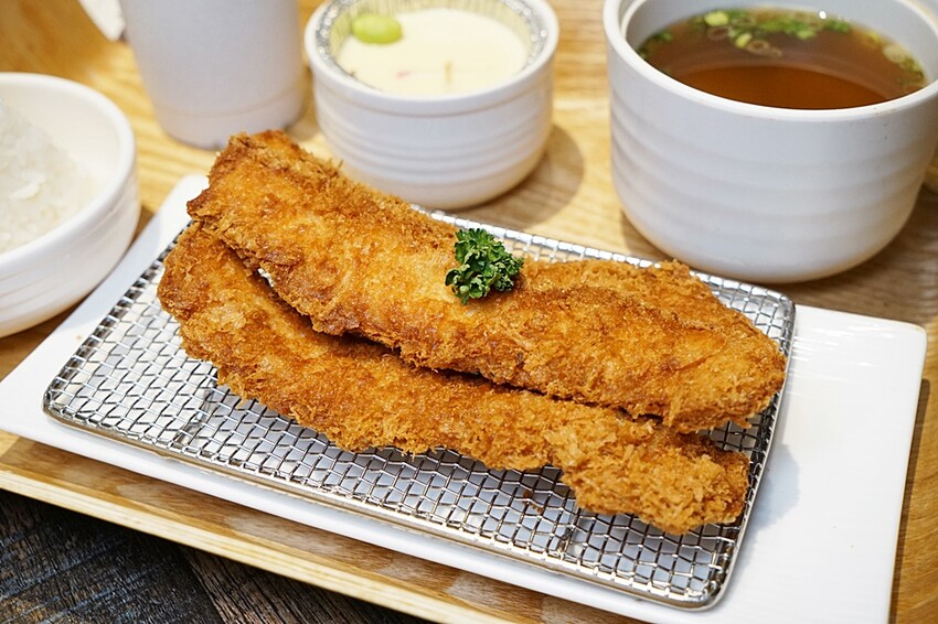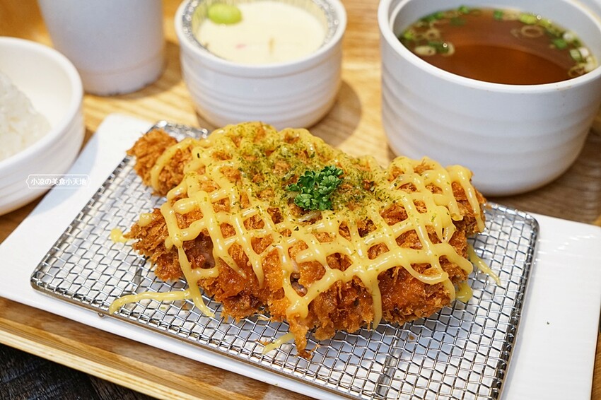 嚴選厚實的豬排將明太子給包起來,炸至金黃香酥再切塊,並淋上噴香的起司醬;入嘴外酥肉嫩帶著鹹甜味兒,還有一股明太子的獨特香味頗涮嘴,加上高麗菜絲、茶碗蒸、米飯、味噌清湯的搭配,吃起來飽足感更是倍增!