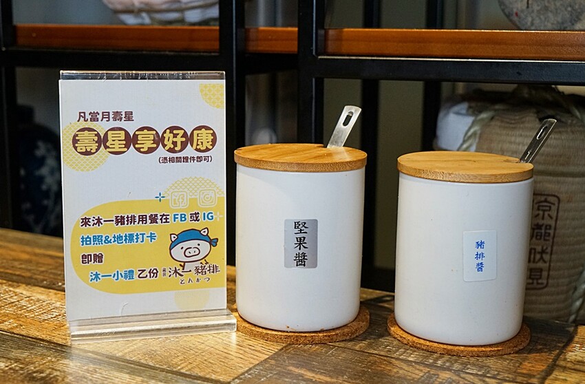 凡當月壽星只要來沐一消費,並拍照上傳FB&地標打卡就送沐一小禮乙份唷! 餐桌上均提供養生堅果醬可淋在高麗菜絲上吃超爽口。豬排醬是店家遠赴日本學回來的豬排專屬醬汁!