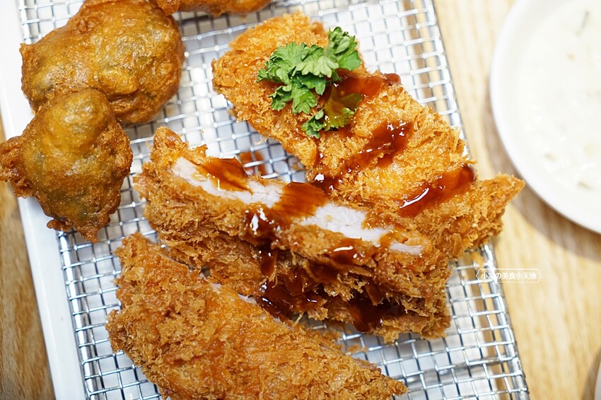 熱熱吃更能感受豬排的美味被酥香的麵衣完全鎖住,一咬口還有卡滋卡滋的酥脆聲響,它的外衣就是不卡油,酥脆軟嫩令人滿意。加上豬排醬後吃又是另一風味呢