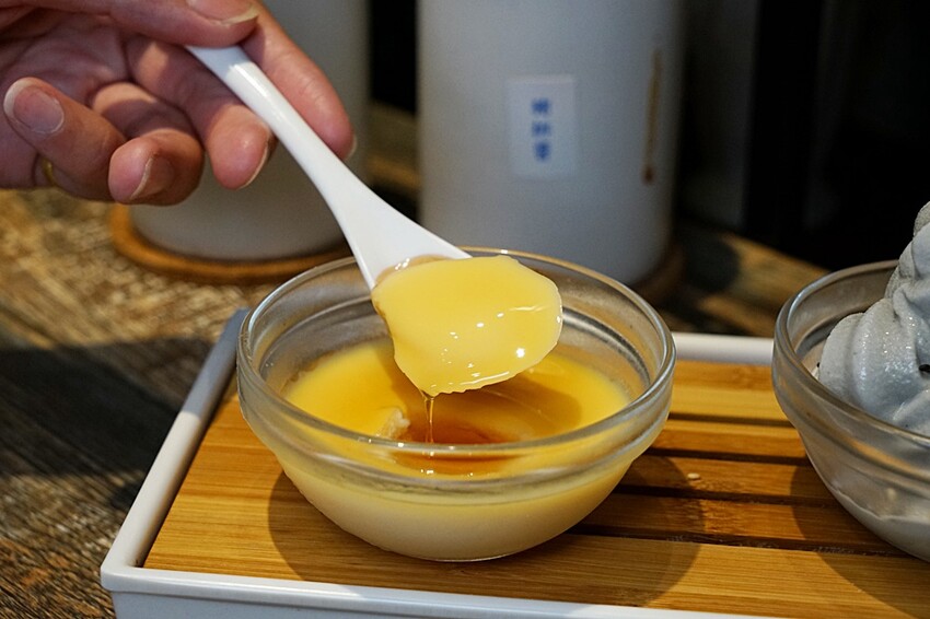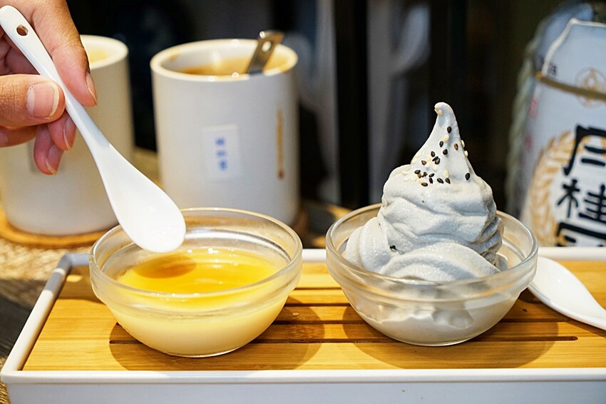 飯後甜點(黑芝麻冰淇淋、焦糖布丁),黑芝麻冰淇淋吃起來不會太甜膩,有著濃郁的芝麻香氣超好吃。