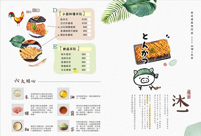 來自日本蔵前的沐一豬排菜單,以從日本學成回歸的豬排為主,為了大食客以及喜歡多口味的朋友也推出了雙拼系列,還有非豬排料理以及小點心,定食套餐除了主食以外還有米飯、高麗菜絲、味噌清湯、茶碗蒸,小菜、飲料及甜點(米飯、味噌清湯可續),飲料有五種可選(熱牛蒡茶、洛神花茶、香濃奶茶、無糖綠茶、冬瓜檸檬),更依照人數推出了不少超值組合餐呢,圖下更是介紹了店家所用食材的來源!