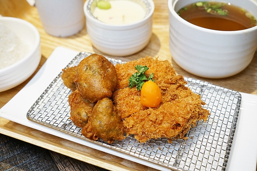 牡蠣拼豬排(附米飯、茶碗蒸、高麗菜絲、味噌清湯、飲料、甜點、塔塔醬)
