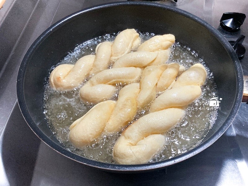 維持這溫度把鬆弛後發胖的麻花捲麵糰下鍋炸,下鍋後要勤快地翻動麵糰讓麵糰均勻受熱上色,雙面炸到琥珀顏色就到撈出瀝油