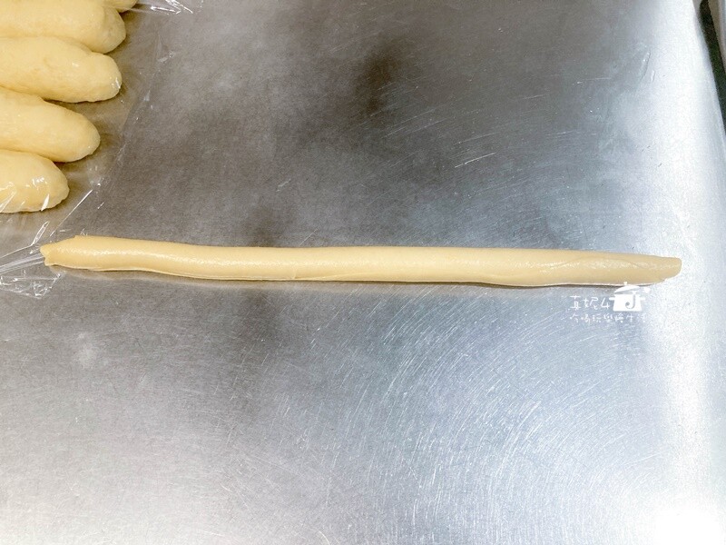 1.發酵完成的麵糰平均分為10等份(一份大約52g),依序搓成長條加蓋保鮮膜再發酵10分鐘