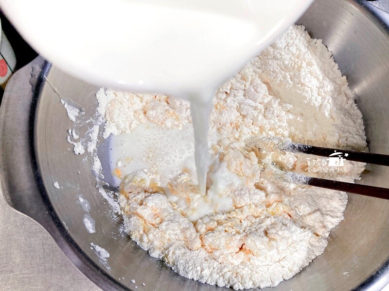 1.面盆中放入中筋麵粉,酵母,糖,鹽,用筷子大致混合後再加入兩顆全蛋和牛奶繼續用筷子混拌到鬆散的塊狀