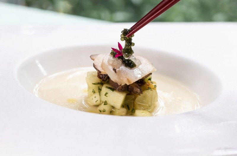 鮑魚切片先單吃一片,再來就是讓鮑魚與香蜂檸檬、酪梨交融在馬鞭草昆布醋,清爽而酸甜的氣味與剛剛單吃鮑魚完全不一樣!