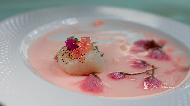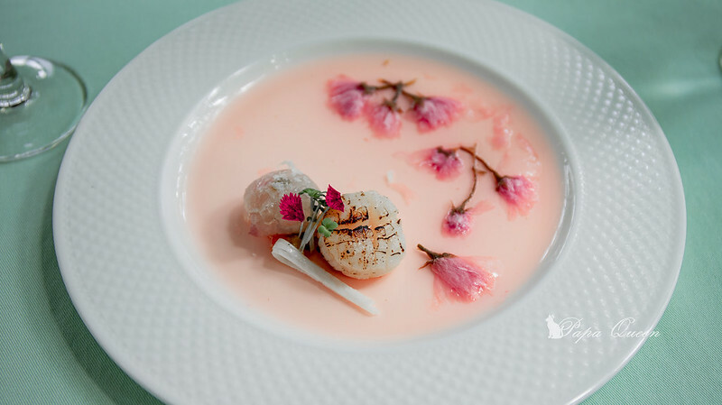 粉色柚子凍鹽漬日本櫻花盤飾(可食)白身魚-選用白鱸底下堆砌著堅果燉菜微辣佐山藥絲,等與炙燒干貝 !
