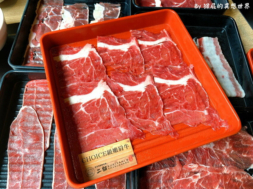 壽喜燒的肉盤自行取用。假日一共有八種肉品,分別是上選牛五花、低脂牛、板腱牛、櫻桃鴨、豬五花、豬梅花、土雞腿肉、雞柳條,其中板腱牛跟櫻桃鴨是假日才有的唷。但平日有另外六款也是很豐富了。