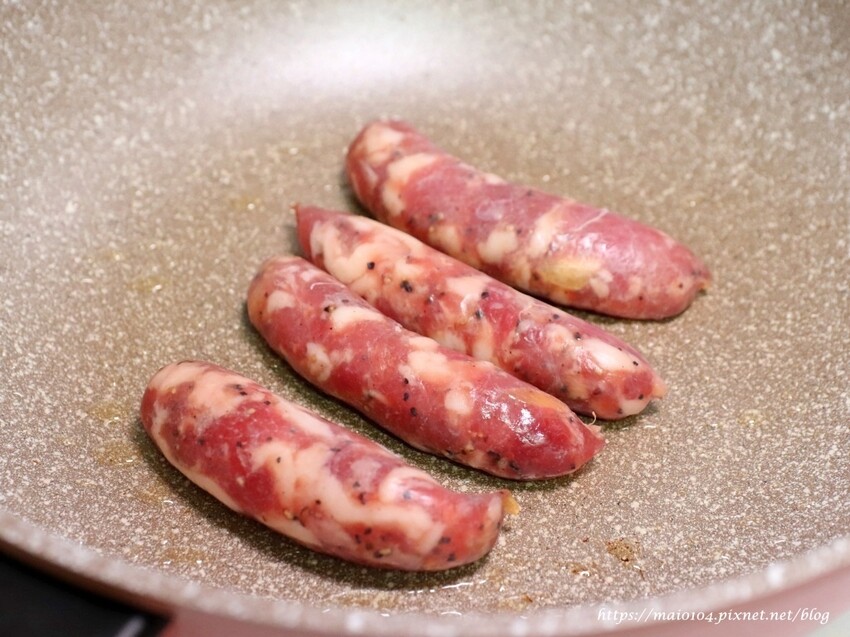 煎:將馬告香腸完全退冰後,熱油鍋下鍋煎至兩面金黃