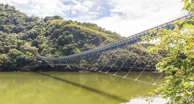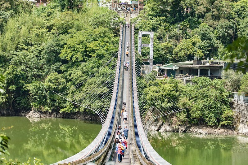 幾個湖景切換後,遠遠就看到吸引許多遊客到來的「新溪口吊橋」,這是第三代的新溪口吊橋,於2018年完工,全長303米303公尺是全台最長吊床式吊橋。順便科普一下,第一代為日治時期(1895年之後)興建,並於大正11(1922)、第二代約建於1963年(民國52年)。
