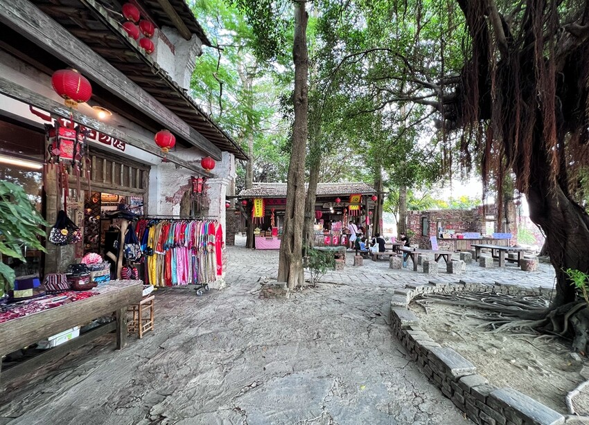 在這還有不少小店有鹽鄉館、大俠客棧等,內販售著咖啡、冰淇淋、古早味零嘴、椪餅、彈珠汽水、在地農產、魚飼料、童玩等,價位都不算高,尤其是魚飼料,比其他觀光景點所販售的便宜許多;在廣場中有棵老榕樹可遮蔭,假日來訪還可欣賞街頭藝人的表演,坐在樹下微風陣陣吹來,聽歌賞景真的悠閒又愜意。