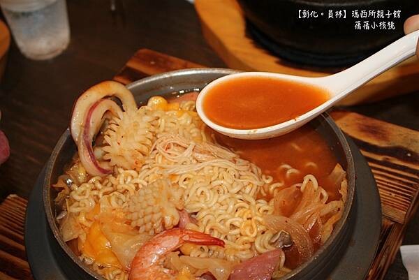 冒著熱氣的海鮮部隊鍋,快要融化的起司,這個畫面實在太逼人,狠狠地夾上一大口韓式泡麵,巴附著一大塊香濃起司的韓式泡麵,一入口,那香濃起司和韓式泡麵的組合,叫艾琳忍不住想要大喊:『瑪西所』~