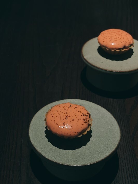 玫粉色的小塔,小巧可愛的像是莓果口味的甜點,原來是紅酒沙巴壅,裡面藏著百里香醃製的生鹿肉。我則是獲得內餡是炒過的蘑菇和紫洋蔥。塔皮薄脆爽口帶些微微的起司鹹香,表面再以杜松粉增添香氣