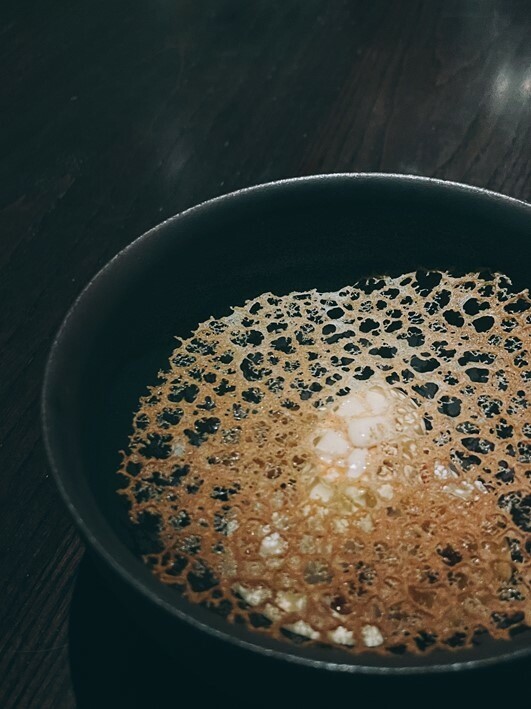 裹了黑麥粉酥炸的南非鮑魚,伊比力豬與歐芹製成的肉丼丁,搭配著的是白酒醋醃製過的紫甘藍,因爲還淋上焦化奶油,在酸爽中帶有奶油的溫醇,雖是配角卻是整道菜我最喜歡的部份⋯鮑魚燉煮的非常軟,但也因此失去了特有的彈韌,和鮮味,加上外皮直接放置在芥末籽的醬汁之上,濕掉不酥脆之外還顯得太油膩。