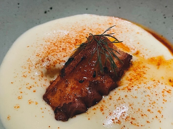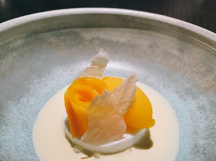 暗紅的燉煮馬祖章魚,靜靜的躺在用氮氣打成的小馬鈴薯與蕃紅花泥上。章魚和鮑魚一樣燉太軟不是我喜歡的口味,但小馬鈴薯泥真的太棒,帶點生馬鈴薯的青澀味,但又用紅椒粉和照燒醬提供一種暖。再往碗中探索,會發現炒過的蕃茄和蕃紅花醃製的馬鈴薯片,一層一層吃下去各種的驚喜。不過口味偏鹹了。