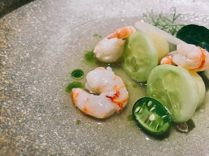 切片去皮小黃瓜,球狀的哈密瓜,置於哈密瓜綠紫蘇冷湯之中,金線蓮葉,切片的蕪菁,紫蘇花,去殻的小白蝦,像是水塘中嬉戲的小蝦躲藏探頭激起陣陣漣漪⋯很特別的是深綠半球,是我從未見過的姆指西瓜,小小一顆擁有瓜皮的香與瓜肉的清甜。