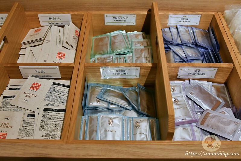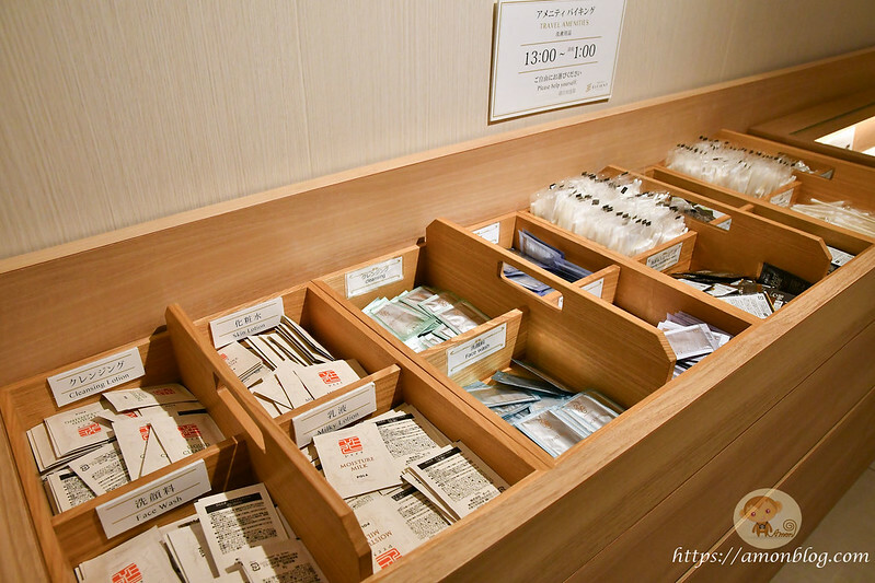 這幾年日本飯店也開始提昌環保概念,除了客房內的基本款盥洗用品外,其他的備品都改成放置在櫃台旁讓客人自取,有需要或者沒自備的話再拿,京都爾樂喜恩特飯店提供的品項還蠻多的,連洗面乳、乳液、化妝水,還有不同品牌可選,讓遊客覺得頗貼心。