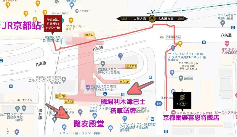 門口正前往就是通往關西機場的利木津巴士站(站名 京都車站八條口,站牌代碼KY2),有前往關西機場的直達巴士,單程約90分鐘,如果搭乘JR的HARUKA特急列車,則是大約80分鐘,兩種交通方式的車程時間沒差很多,就看個人喜好了,我這次就是直接搭JR的。利木津巴士線上購票較便宜喔>