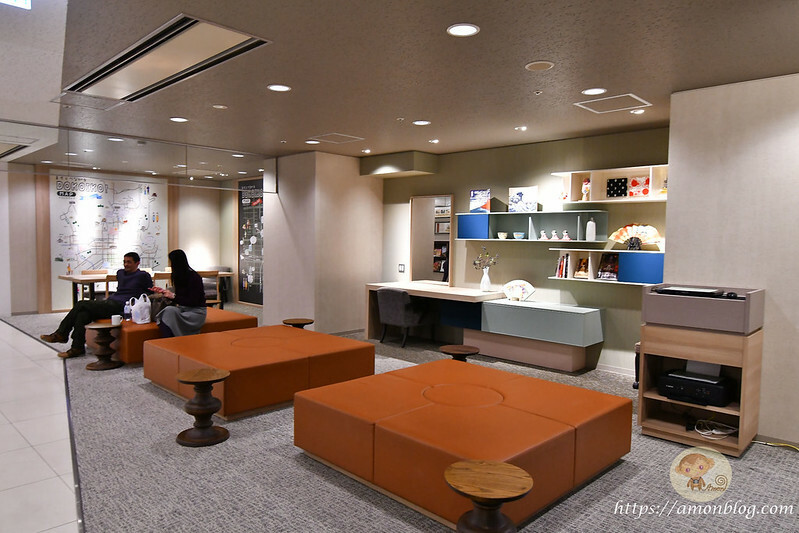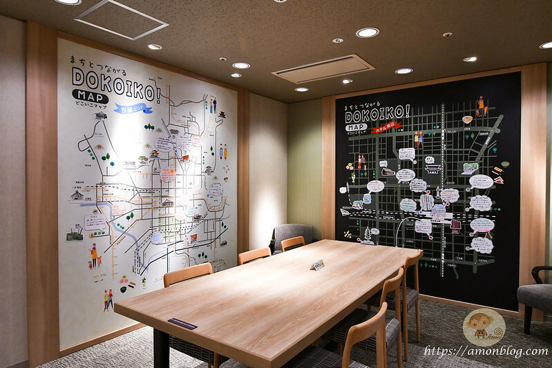 如果晚上想和朋友在飯店一起哈拉聊天,在一樓有一個舒適的休息區可以使用,休息室的牆壁上還有京都旅遊地圖,如果需要行程討論的話,也可以參考牆上地圖。