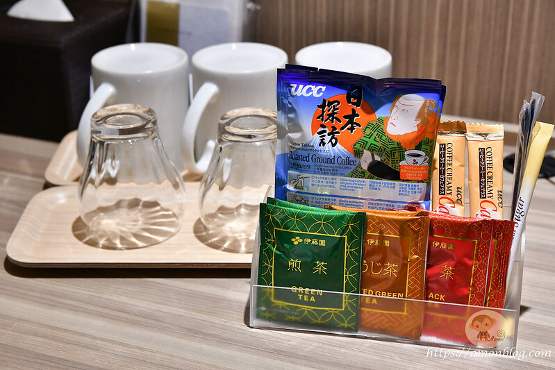 一開始想說商務飯店,所以茶包大概就是很基本款的兩種這樣,沒想到給了三種茶包再加上一種UCC即溶咖啡,杯子也有冷飲用玻璃杯和熱飲用馬克杯,誠意十足。