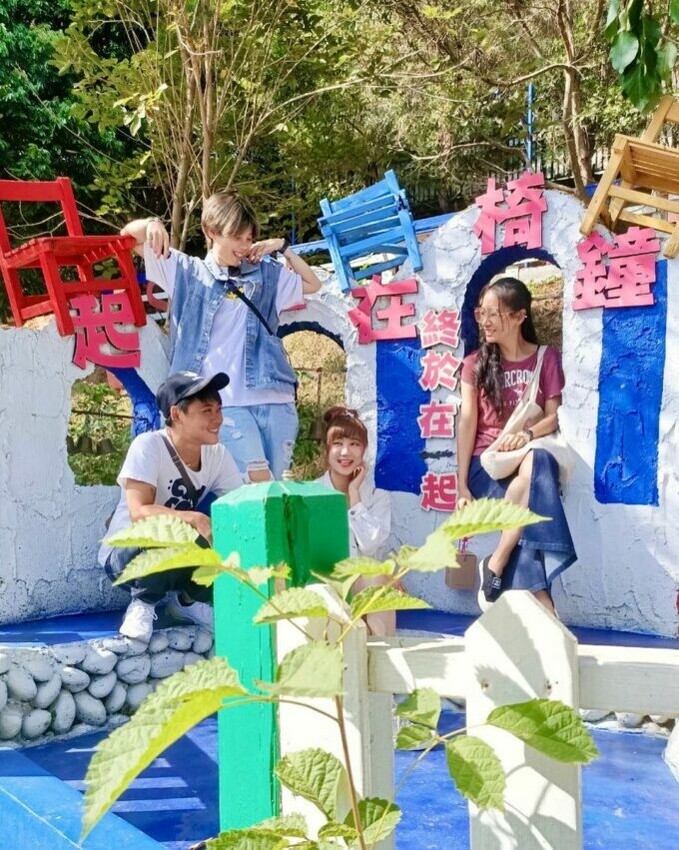 這個漆上藍白的區域,用椅子和鐘組成的鐘椅再一起,取「鐘」、「椅」的諧音,營造出「終於在一起」充滿地中海風情的浪漫造景,另外,園區內還有許多相框造型的擺設,希望遊客在這裡都能跟家人、朋友、情人們一起合照留下回憶的痕跡。