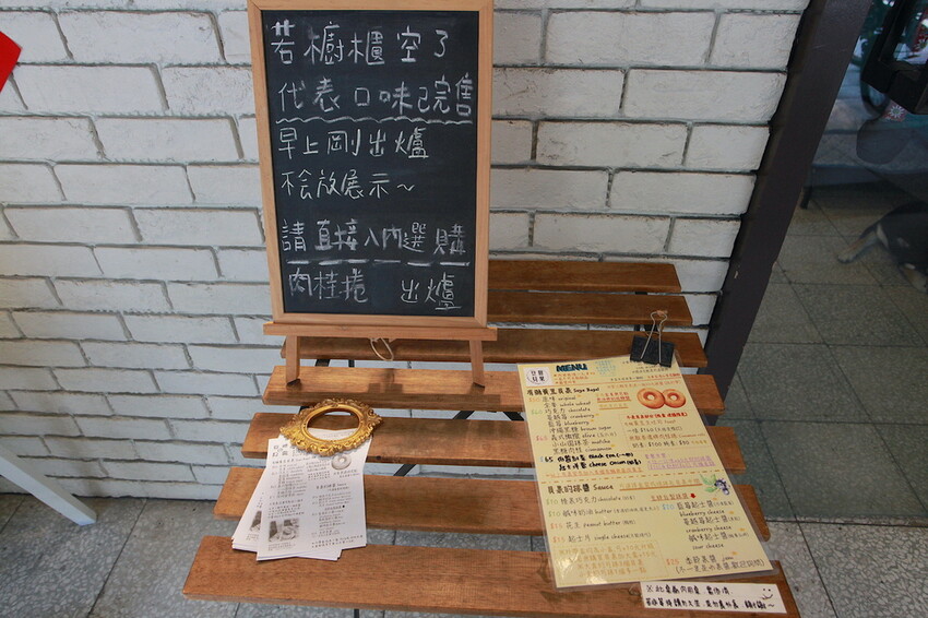 店外頭有貼店家DM供顧客觀看,上面有餐點照片跟貝果自家特色。