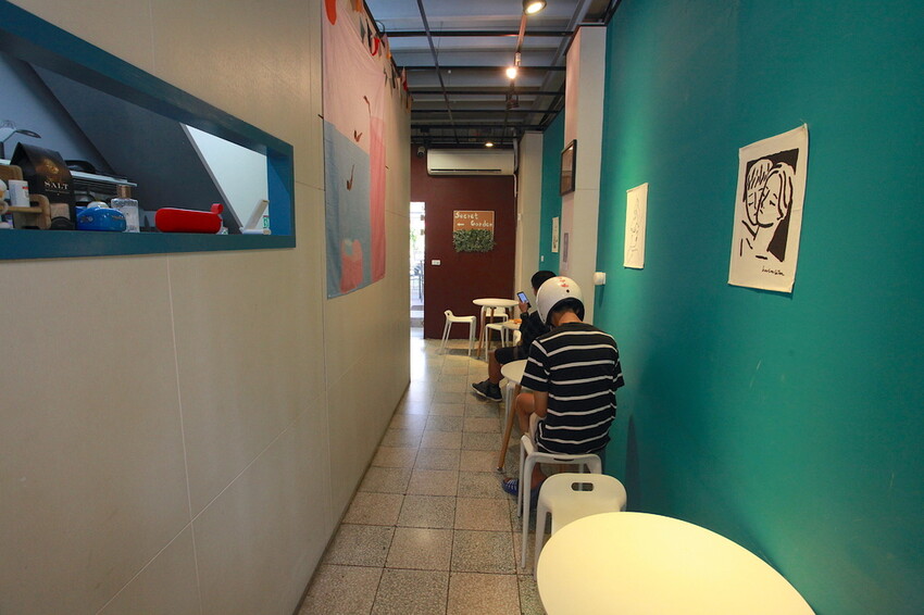 狹窄走廊放兩人桌椅供顧客坐下來用餐,有點擁擠有裝設冷氣供舒服用餐。