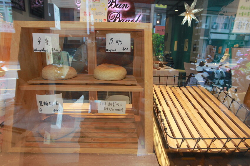 從外面櫥窗就看到木製玻璃櫥櫃,櫥櫃裡面放置各種貝果供行人參考,這樣陳設確實會吸引我進去購買。