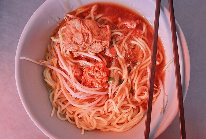 這天我們點了都是小碗的意麵、油麵、湯粄條以及一碗龍鳳湯,招牌的意麵、油麵真的挺不錯好吃,而龍鳳湯就是魚丸、貢丸各一顆,丸子的Q度很不錯,蔬果姐妹都很喜歡;愛吃辣的朋友就要添加店家的辣椒醬,另外他們也有不少小菜滷味可以點選,在用餐時間可是要花時間排隊等候。