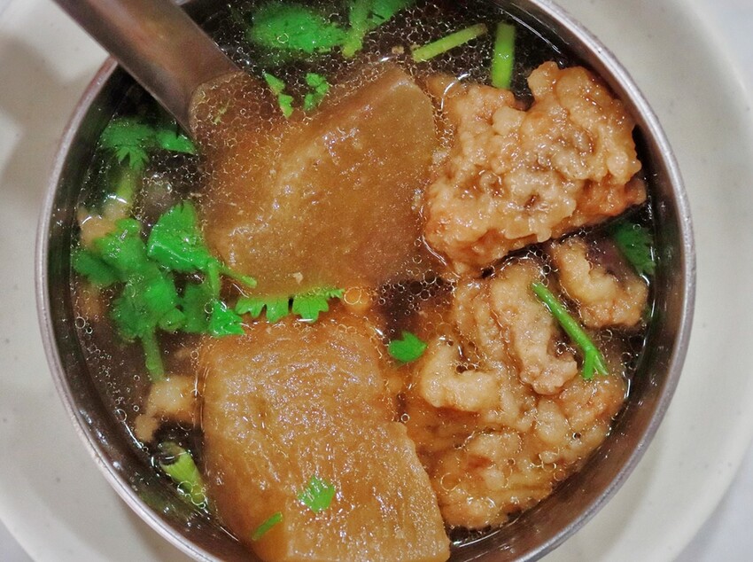 點了肉丸、肉羹、熱狗各一份,真心的喜歡湯家大肉圓的肉羹,基底是高麗菜熬煮的羹湯,肉羹挺Q彈且配量很多;而苗栗市區所說的”熱狗”就是我們一般認知的黑輪,配上苗栗特有的醬沾(大量的韭菜、醬油)真的很特別;肉圓皮很Q,內餡筍乾很香、肉塊處理得恰到好處,加辣吃更有層次感!
